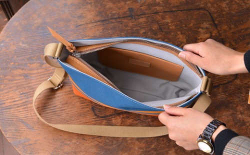 ここ近江八幡は、明治時代、県内の有志が集まり、国内初の西欧式帆布製造を完成しました。こういった歴史的なモノづくり精神にインスパイアされ、滋賀県で作られた帆布を使った八幡帆布鞄を作りました。八幡堀近くの工房で一つ一つ丁寧に鞄を手作りしております。使用している帆布は8号帆布で耐久性も高く、革も国内で作られている高級なものを使用しております。デザインは、八幡堀をイメージし、古い中にも新しさがある、レトロモダンをイメージして作っております。幅広い年齢層の方にご支持をいただき、最近は海外の旅行者様にも人気のアイテムとなっております。こちらのモデルは裏地が付いており、ポケットがひとつ付いております。バッグの口の部分にはファスナーが付いていますので、安心してご利用いただけます。