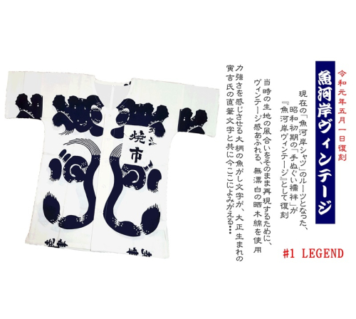 【説明】現在の魚河岸シャツのルーツとなった、昭和初期の「手ぬぐい襦袢」の復刻品『魚河岸ヴィンテージ』&魚河岸うちわセットをお届けします。当時の生地の風合いをそのまま再現するために、ヴィンテージ感あふれる無漂白の晒木綿を使用。新しく年号が変わった日・令和元年5月1日に発表されたこの魚河岸ヴィンテージは新聞やテレビ等に何度も取り上げられています。静岡県郷土工芸品にも指定されている、日本伝統の染色技法「注染そめ」で大柄の魚河岸文字を染めた反物を、熟練の和裁士が1枚1枚丁寧にシャツに仕立てた、認定証付きのこだわりの品。本染めならではのやさしく柔らかな風合いが特徴で、肌触りも良く吸水性・通気性にも優れていて使い込むほどに色が落ち着き味わいが出ます。「魚河岸うちわ」とセットでお届けさせていただきます。