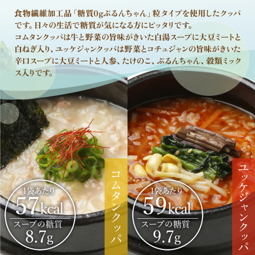 スープまで飲み干してもコムタンは1袋当たり57kcl(糖質8.7g)、ユッケジャンは1袋当たり59kcl(糖質9.7g)と、日々の生活で糖質が気になる方にピッタリです。