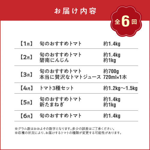 - 金賞受賞 大好評 1月?6月毎月発送 6か月楽しめる 長田農園 旬 スペシャル 定期便 6回 ジュエリートマト トマトベリー さくらんぼトマト フルーツトマト ミニトマト トマトジュース にんじん 新たまねぎ セット 野菜 新鮮 産地直送 愛知県 碧南市 送料無料 H004-166