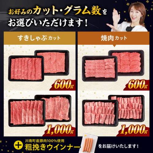 - ※発送時期・グラム・カットが選べる※生産者応援!宮崎牛 赤身・霜降りすきしゃぶor焼肉 2種600g~1000g+粗挽きウインナー90g【 数量限定 すき焼き スキヤキ しゃぶしゃぶ スライス 肩ロース ウデ モモ 牛肉 牛 肉 A4ランク 4等級 A5ランク 生産者応援企画! ウインナー 】
