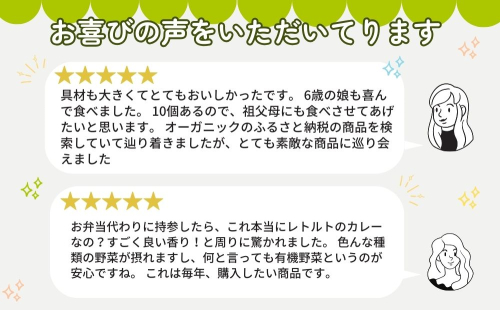 こうしたことは新規就農支援だけでなく耕作放棄地や遊休地を有効利用し、若い方の田舎への定住促進や地域雇用にも繋がっています。 我々は今後も有機農業にこだわり続けていきます。 【原材料】 カレー:野菜(人参、じゃがいも、玉ねぎ、大根)、鶏がらスープ、しめじ、ソテーオニオン、リンゴピューレ、小麦粉、トマトケチャップ、おろしにんにく、植物油脂(菜種)、砂糖、バター、カレー粉、醤油、おろししょうが、食塩、クミン、コリアンダー、大和まな粉末/カラメル色素(一部に小麦・乳成分・鶏肉・りんご・大豆を含む)