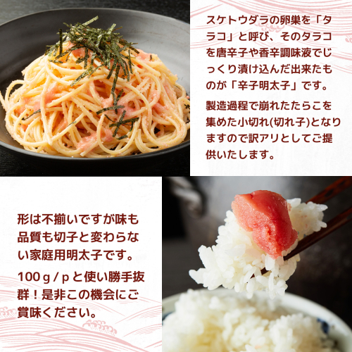 形は不揃いですが、味も品質も切子と変わらない家庭用明太子です。100g/pと使い勝手抜群!是非この機会にご賞味ください。