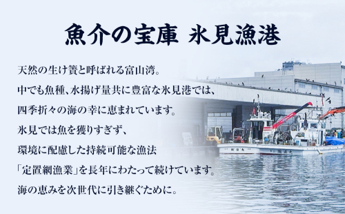 富山湾は「天然の生け簀」と称されるほど多種多様な魚介類が一年を通じて水揚げされます。また、氷見が発祥の地である越中式定置網漁は、豊富な魚介類を「採り過ぎない」ことで水産資源を守る持続可能な漁法として、世界からも注目されています。