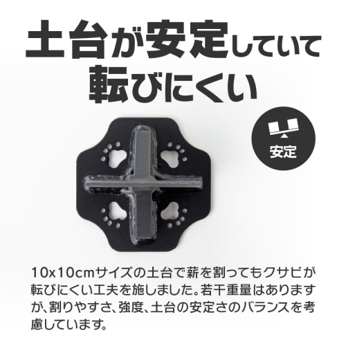 [土台が転がりにくく安定] ファミリーキャンプでも女性やお子様でもご使用いただけます。 太い広葉樹、節のある薪、高級な堅い薪など、薪の種類によっては割れなかったり、割りづらいものがございますので あらかじめご了承ください。