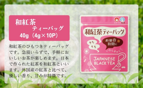 緑茶ティーバッグ50g(5g×10P)、ほうじ茶ティーバッグ40g(4g×10P)、抹茶入玄米茶ティーバッグ50g(5g×10P)、和紅茶ティーバッグ40g(4g×10P)、微粉末緑茶 50g