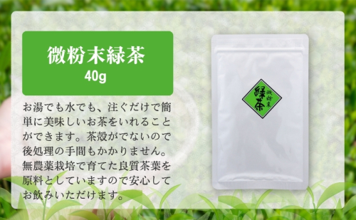 急須いらずのティーバッグは温でも冷でもOK! 4種類の味の違いが楽しめます。 微粉末緑茶もお湯にいれて混ぜるだけで簡単に溶けお茶の栄養をまるごと摂取出来ます。 外出先やオフィスでも美味しい森の茶をお楽しみください。