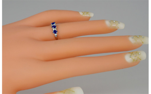 オーバルカットのサファイヤ3石の間にダイヤモンド6石を配置し、可愛らしさの中にも大人っぽさのあるリングです。