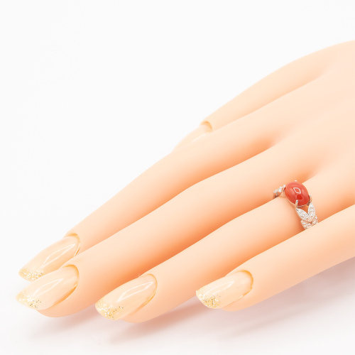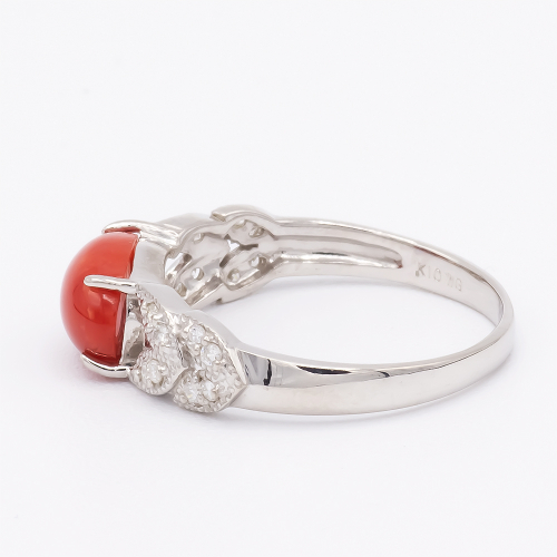 貴重な赤サンゴを、16石のダイヤモンドが彩る可憐なリングです。