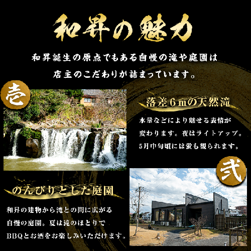 焼肉が美味しいことはもちろんのこと、店舗敷地に解放感を感じる広い庭園と、さらに落差6Mの天然の滝を有し、他に類するものもない寛ぎの焼肉屋として親しまれております。