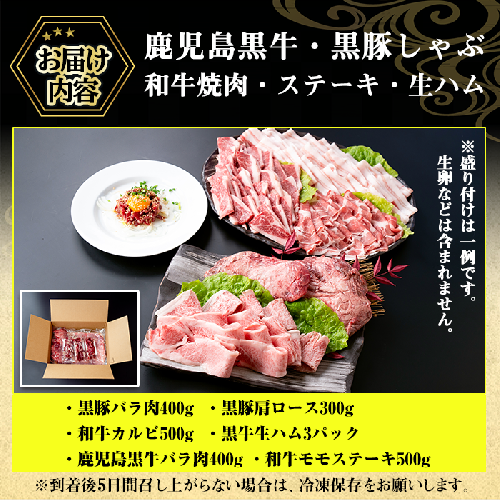 - No.454 鹿児島黒牛・黒豚のしゃぶしゃぶと和牛焼肉・ステーキと生ハムの贅沢セット(6種・計2.1kg超) 鹿児島県産 豚肉 牛肉 バラ肉 肩ロース カルビ もも肉 バーベキュー【やきにく茶屋和昇】