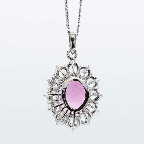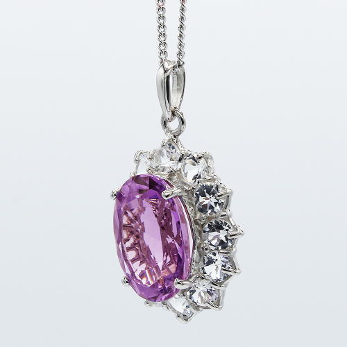 周りを取り巻いているホワイトトパーズを留める際、隣の石との隙間が出ないように細心の注意をはらい職人が1石、1石手作業で留めたもので、アメジストをホワイトトパーズの花びらで包み込んでいるかのような美しい仕上がりとなっているペンダントです。