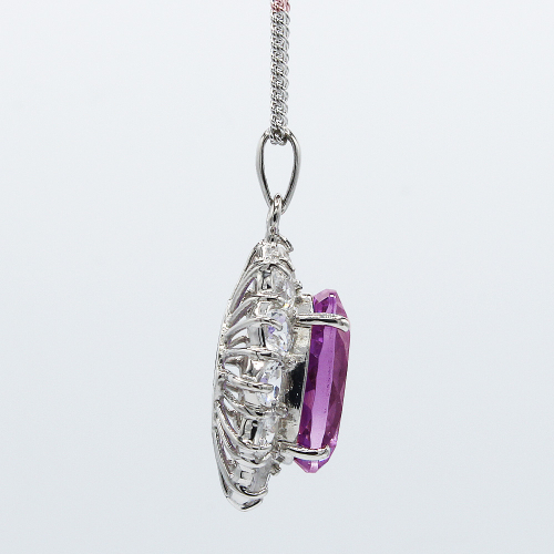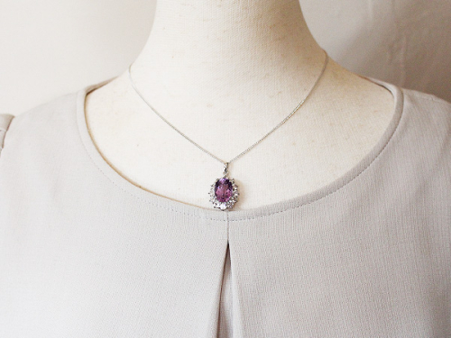 6.0カラットの大粒アメジストを使用し、直径4mmのホワイトトパーズで上品に取り巻いたエレガントでオシャレなデザインのペンダントです。