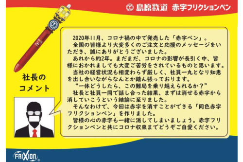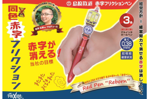 Red Pen "Reborn" 初代のDNAを引き継ぎ生まれ変わった「赤字ペン」 赤字の鉄道会社だからこそ作れた珠玉の1本!!として2020年11月に発売し、大変話題となりました「赤字ペン」の第2弾!今回は、赤字が消える「赤字フリクションペン」です。 この商品はパイロットコーポレーションから販売されている「3色フリクションペン」をベースとしており、3か所すべてが赤字(赤色)で、太さは全て超極細の0.38mmとなっています。(島原鉄道の超極細の経営状況を表しています)※3か所とも全て赤色インキを使用したフリクションペンは業界初です。 さらに、フリクションペンの機能を活かして“赤字”を消すことができるという点が、今回の「赤字ペン」の最大の特徴となっています。 なお、本企画は銚子電鉄の「まずい棒」「お化け屋敷電車」などを企画プロデュースする、寺井広樹氏のプロデュース企画となります。 島原鉄道は大変厳しい経営状況が続きますが、消せる“赤字”から消していき、黒字を目指します!