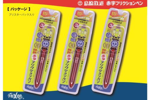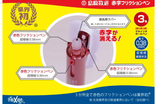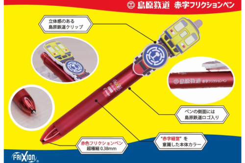 この商品はパイロットコーポレーションから販売されている「3色フリクションペン」をベースとしており、3か所すべてが赤字(赤色)で、太さは全て超極細の0.38mmとなっています。(島原鉄道の超極細の経営状況を表しています)※3か所とも全て赤色インキを使用したフリクションペンは業界初です。