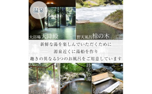 敷地内に7本の源泉を所有し、川沿いの野趣溢れる露天風呂や大浴場で温泉三昧。