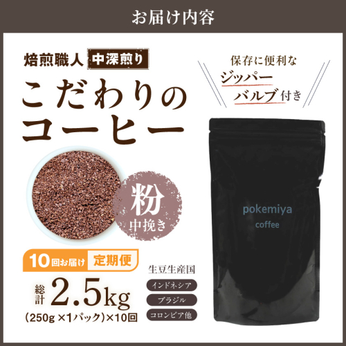 10回お届け!焙煎職人こだわりのコーヒー定期便【粉】250g 小分けパック(ジッパー・バルブ付) ※中深煎り※ポスト投函_TLA10-3301 630540 - 宮崎県都城市