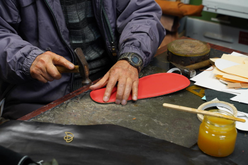 革の裁断、型付け、縫製、検品といった一連の工程をすべて市内工房にて行っています。