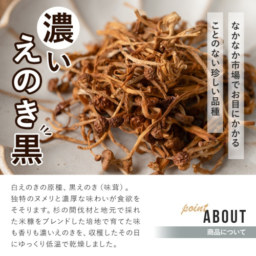 杉の間伐材と地元で採れた米糠をブレンドした培地で育てた味も香りも濃いえのきを収穫したその日にゆっくり低温で乾燥しました。