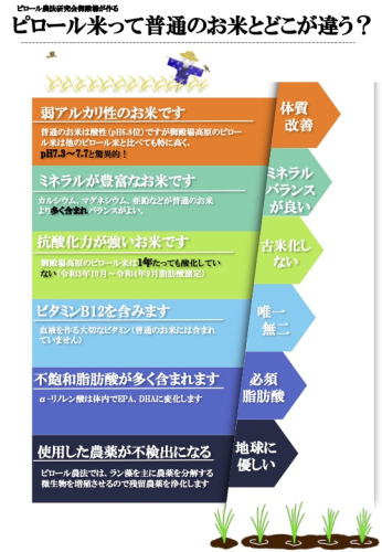 ミネラル豊富な弱アルカリ性のお米 ピロール農法でつくった御殿場こしひかり。 【ピロール農法とは】 ・地球にやさしい持続可能な農法(SDGs) ・36憶年前から地球上に存在する土中の微生物「ラン藻」を増やす農法 ・ラン藻は、富士山のミネラル豊富な水により増殖し土を肥沃にして粒ぞろいのよいモチモチのお米を作ります ※着日指定不可 【産地名】 静岡県御殿場市 【品種】 御殿場こしひかり(ピロール米) 【産年】 令和7年産 【使用割合】 単一原料米 【精米時期】 別途袋に記載 【保存方法】 高温多湿を避け冷暗所で保管してください 【製造者】 ピロール農法研究会御殿場 静岡県御殿場市中丸299-1