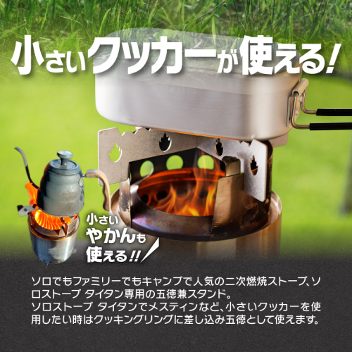 [ソロストーブ タイタンで小さいクッカーが使える] ソロでもファミリーでもキャンプで人気の二次燃焼ストーブ、ソロストーブ タイタン専用の五徳兼スタンドです。 ソロストーブ タイタンでメスティンなど、小さいクッカーを使用したい時はクッキングリングに差し込み五徳として使えます。