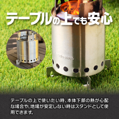 [テーブルの上でも安心してソロストーブが使える] テーブルの上で使いたい時、本体下部の熱が心配な場合や、地場が安定しない時はスタンドとして使用できます。