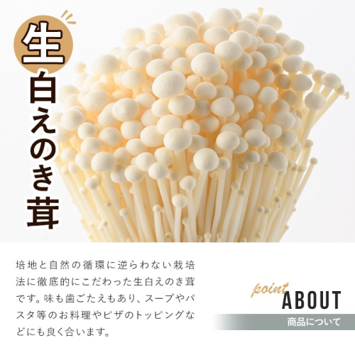 【生白えのき茸】 培地と自然の循環に逆らわない栽培法に徹底的にこだわった生白えのき茸です。味も歯ごたえもあり、スープやパスタ等のお料理やピザのトッピングなどにも良く合います。