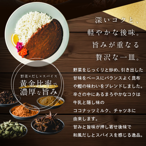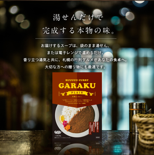 札幌ルーカレー(北海道ではカレーライスをルーカレーと呼びます) スパイシーでだし香る人気店GARAKU のルーカレーが完成しました。 GARAKUの特徴であります秘伝スパイスと濃厚和風だしにプラスしてルーカレーの滑らかな食感にこだわりました。 野菜をじっくりと炒め引き出した甘味をベースにバランスよく昆布や鰹の味わいをブレンドしました。 辛さの中にあるまろやかなコクは北海道産牛乳と隠し味のココナッツミルク、チャツネに由来します。 また北海道を代表するルーカレーを目指していますので濃厚でしょっぱさよりも甘みと旨味が押し寄せ後味で和風だしとスパイスが感じられます。