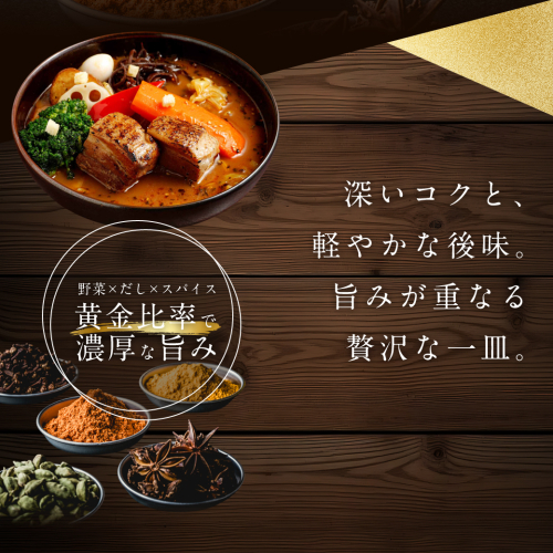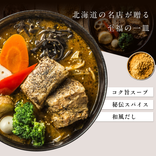 野菜と3種の肉の旨味をベースに函館産真昆布、かつおの風味を効かせた豚バラ角煮のスープカレーです。
