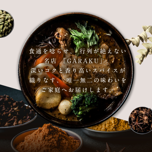 「スープカレーと和風ダシの融合」人気店GARAKUの味をご家庭でお愉しみください。