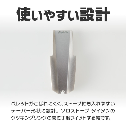 ペレットがこぼれにくく、ストーブにも入れやすいテーパー形状に設計。 ソロストーブ タイタンのクッキングリングの間に丁度フィットする幅です。