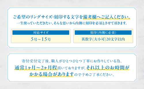 一生使っていただきたい、そんな思いから内側に刻印を必須とさせて頂きます。英数字(大小可)20文字以内で備考にサイズと共にご入力ください。