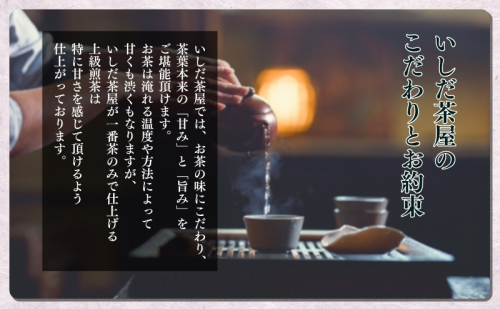 茶師が茶葉にこだわり、丹精込めて仕上げたお茶になります。また、いしだ茶屋のお茶は、お茶の味に最大限にこだわり、茶葉だからこそ味わえる本来の「甘み」と「旨み」を追及して製造しております。