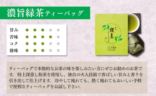 当店の濃旨緑茶ティーバッグは、発売以来、多くのお客様にご愛用頂いている人気商品です。ティーバッグで本格的なお茶の味を楽しみたい方にぜひお勧めのお茶です。