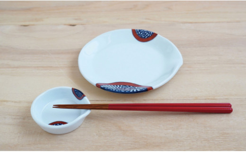 有田焼の伝統的文様のタコ唐草をアレンジしたお洒落な組み合わせ。 大小共に箸を置ける凹みがあり衛生的に使用出来、裏もフラットになっているために 水滴が溜まる事もありません。 また、重ねて収納もできます。食卓にセットしておけば便利です。  (多少の誤差はありますが手描きゆえの味わいです。ご了承ください。) 提供:やきもの工房こすず