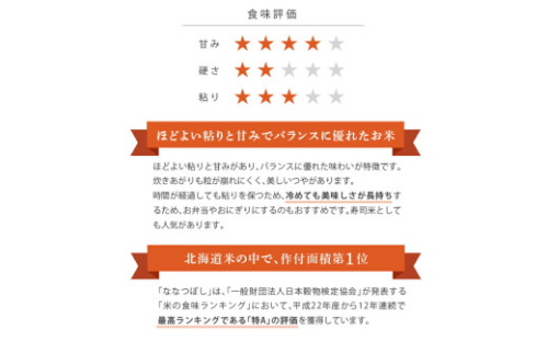 ツヤ、粘り、甘みのバランスが抜群で冷めてもおいしさが長持ちします。 米の食味ランキングでも“特A(最高)ランク”に評価されているお米です。 北海道では多くのレストランやホテルで使用されています。