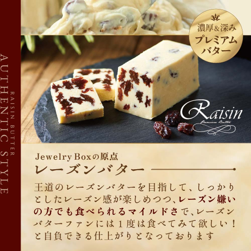 『Jewelry Boxのフレーバーバター』とはJewelry Boxのレーズンバターは、ラム酒ではなくブランデーに漬け込んだレーズンを使⽤。