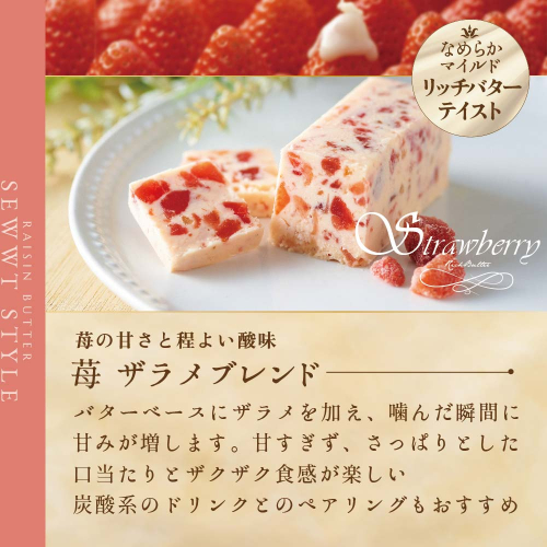 アレンジバターベース『リッチバターテイスト』で作られたフレーバーは、レーズンバターという枠を超えた進化系の味わいを⽬指し、「⽢味」「⾵味」「⾷感」をドライフルーツに合わせてブレンドし、いろいろな味わいが楽しめるフレーバーとなっています。