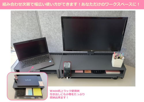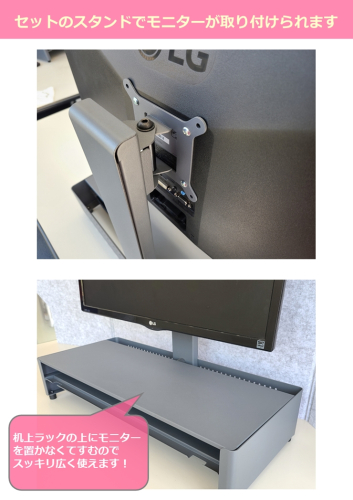 本商品セットのモニタースタンドと組み合わせてモニターを取り付けられるので、作業スペースが更に広がります。
