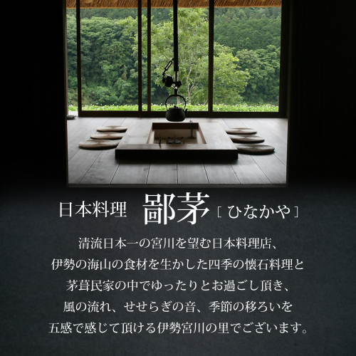 「2019ミシュランガイド愛知・岐阜・三重特別版」で料理の評価として一つ星、快適度は特に快適で魅力的であると掲載された、多気町を流れる宮川を望む田園風景の中に佇む日本料理店『鄙茅(ひなかや)』