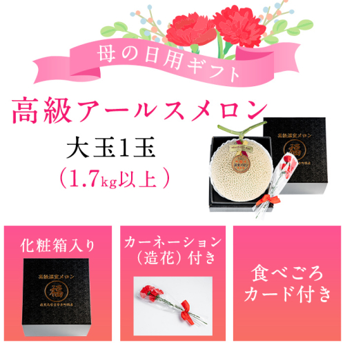 【0151112a-M】<母の日ギフト・数量限定>高級アールスメロン(大玉1玉・1.7kg以上、カーネーション(造花)付) メロン フルーツ 果物 果実 1キロ 数量限定 期間限定 贈答 贈り物 母の日【マル福園芸組合】