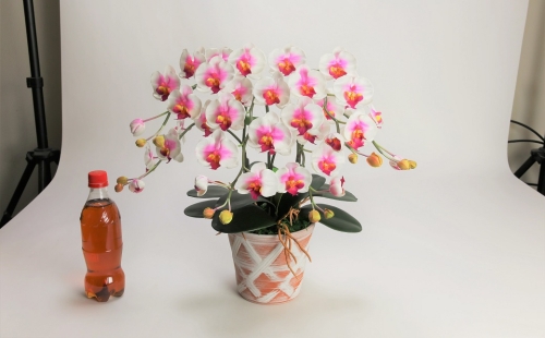 - 綺麗で丈夫な三河陶器で贈る光触媒胡蝶蘭小輪3本立(赤白の陶器×白桃色の花) H100-086