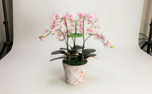 三河焼の植木鉢に、造花の胡蝶蘭小輪3本を仕立て、消臭効果のある、光触媒加工を施した品。