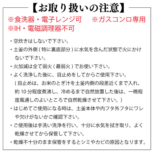 ・はじめてご使用になる時は、土釜本体や内フタ外フタにワレや欠けがないかご確認下さい。