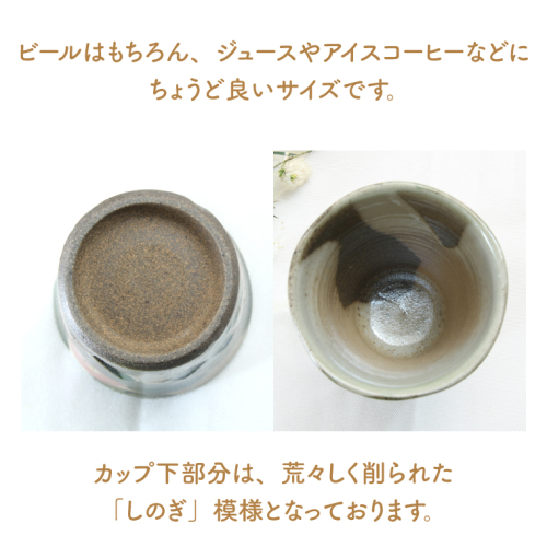 益子焼窯元よこやまの優しい風合いの椿シリーズの新作フリーカップです。ビールはもちろん、ジュースやアイスコーヒーなどにちょうど良いサイズです。作家による手作りのカップは、縁などを微妙に変形させたデザイン。カップ下部分は、荒々しく削られた「しのぎ」模様となっております。絵付けは椿模様。作家がひとつひとつ絵付けをいたしました。素朴な益子焼の風合いに優しい色使いの椿模様が魅力です。