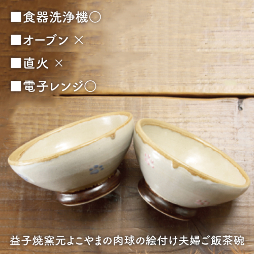 益子焼窯元よこやまの肉球の絵付け夫婦ご飯茶碗です。サイズは微妙ですが、大小となっており、少しのサイズ違いとなっております「夫婦セット」となっております。ブルーとピンクでひとつひとつ絵付けされた肉球。焦げ茶色の部分は益子の伝統的な釉薬「あめ釉」を使用。全体に真っ白ではなく、薄いベージュのような風合いで、益子焼らしい素朴感が味わえます。毎日の美味しいごはんを、陶器の風合いと一緒にお楽しみください。