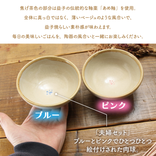 【益子焼】夫婦ご飯茶碗ピンク&ブルー肉球ペア2個セット|お茶碗 肉球 あめ釉 素朴 陶器 食器洗浄機可 電子レンジ可(BH002)