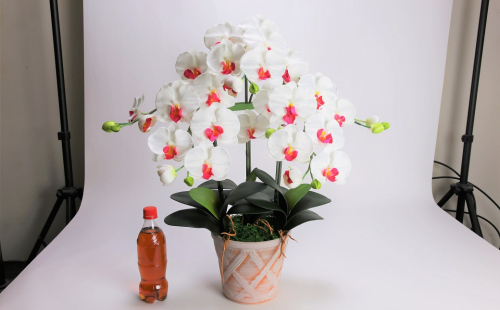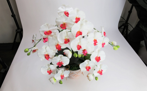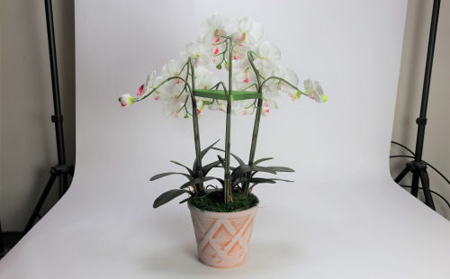三河焼の植木鉢に、造花の胡蝶蘭大輪3本を仕立て、消臭効果のある、光触媒加工を施した品。