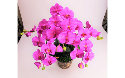 三河焼の植木鉢に、造花の胡蝶蘭大輪3本を仕立て、消臭効果のある、光触媒加工を施した品。