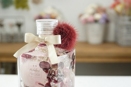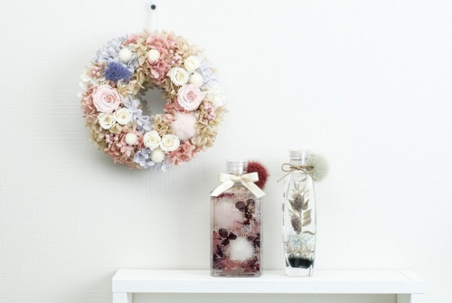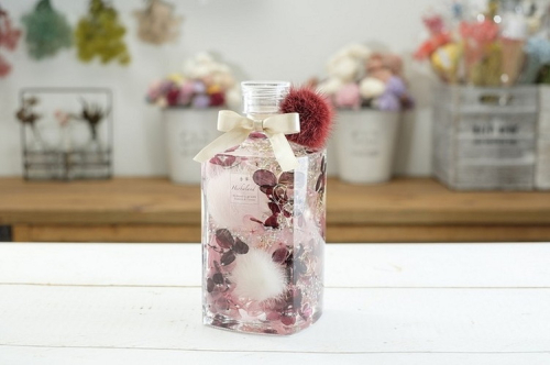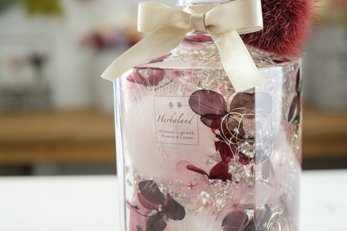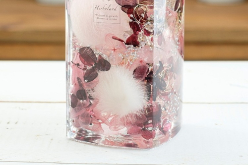 ハーバリウム(Herbarium)とはプリザーブドフラワーやドライフラワーを専用のオイルの入ったガラスボトルに入れて、みずみずしい状態でお花やリーフを鑑賞していただける新感覚のインテリア雑貨です。 リビングやキッチン、玄関などのちょっとしたスペースに置くだけで魅惑の小さな癒し空間を演出してくれます。ハーバリウムはお手入れが不要なので長く持続して楽しむことが出来ます。今回は初めて毛皮の宝石と呼ばれるミンク毛皮のモチーフを中に入れてみました。小さなお花と同様にオイルの中で微かに揺れるさまがとっても繊細で癒し効果も抜群!またガラス瓶の首の部分にも同じミンク毛皮のポンポンをアレンジしました。昼間は窓からの太陽光が、夜はお部屋のライトからの光が反射してお花やミンクを幻想的に輝かせてくれて、他では味わえない独特の雰囲気を醸し出してくれます。自分へのご褒美そしてお友達、家族、職場の方へのプレゼントに如何ですか。この商品は香華さんとの共同企画商品となります。